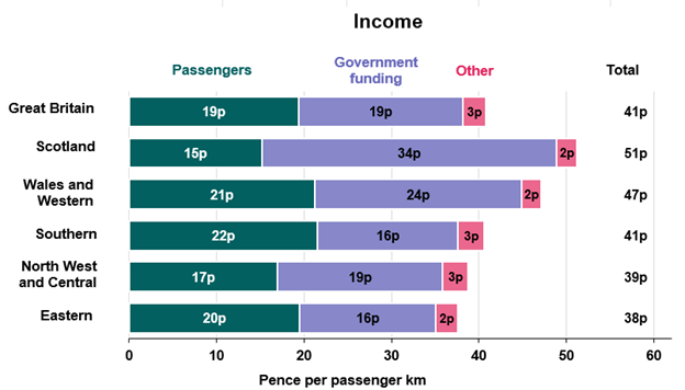 The rise in fare revenue contributed to a reduction in funding from the UK and devolved governments towards the operation of the railway. This fell to £11.9 billion in the year, down £0.9 billion from the previous year. Our statistics show that passengers in Scotland received the highest level of government support per passenger kilometre travelled compared with other regions.